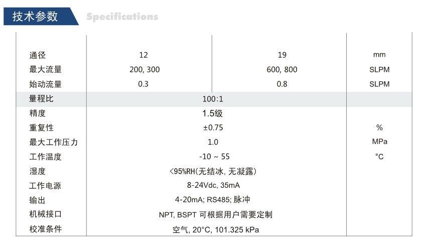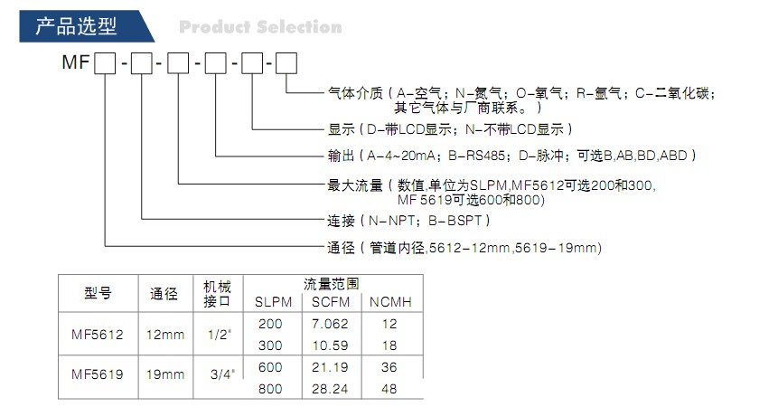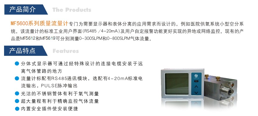现有产品MF5612和MF5619可以分别测量0〜300slpm和0〜800slpm气体流量。